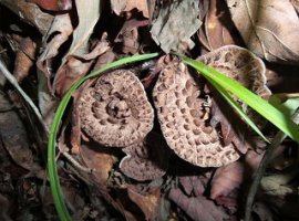 능이버섯(향버섯)갓은 직경 10~25센티미터이다.대형의 깔때기 모양이다. 다갈색으로 뿔모양의 돌기가 있다. 갓의 중심부는 깊게 파이고 때로는 줄기의 뿌리 부위에 달하는 것도 있다.처음은 담홍색이었다가 차차 갈색으로 된다. 건조하면 거의 흑색으로 되고 강한 향기를 낸다.갓 하면에는 가는 비늘이 있고 줄기에 반 정도 까지 침이 붙어 있다. 가을에 참나무, 물참나무 등의 활엽수림에 생긴다.독특한 방향이 있으므로 향버섯 이라는 이름이 붙었다고 한다.
