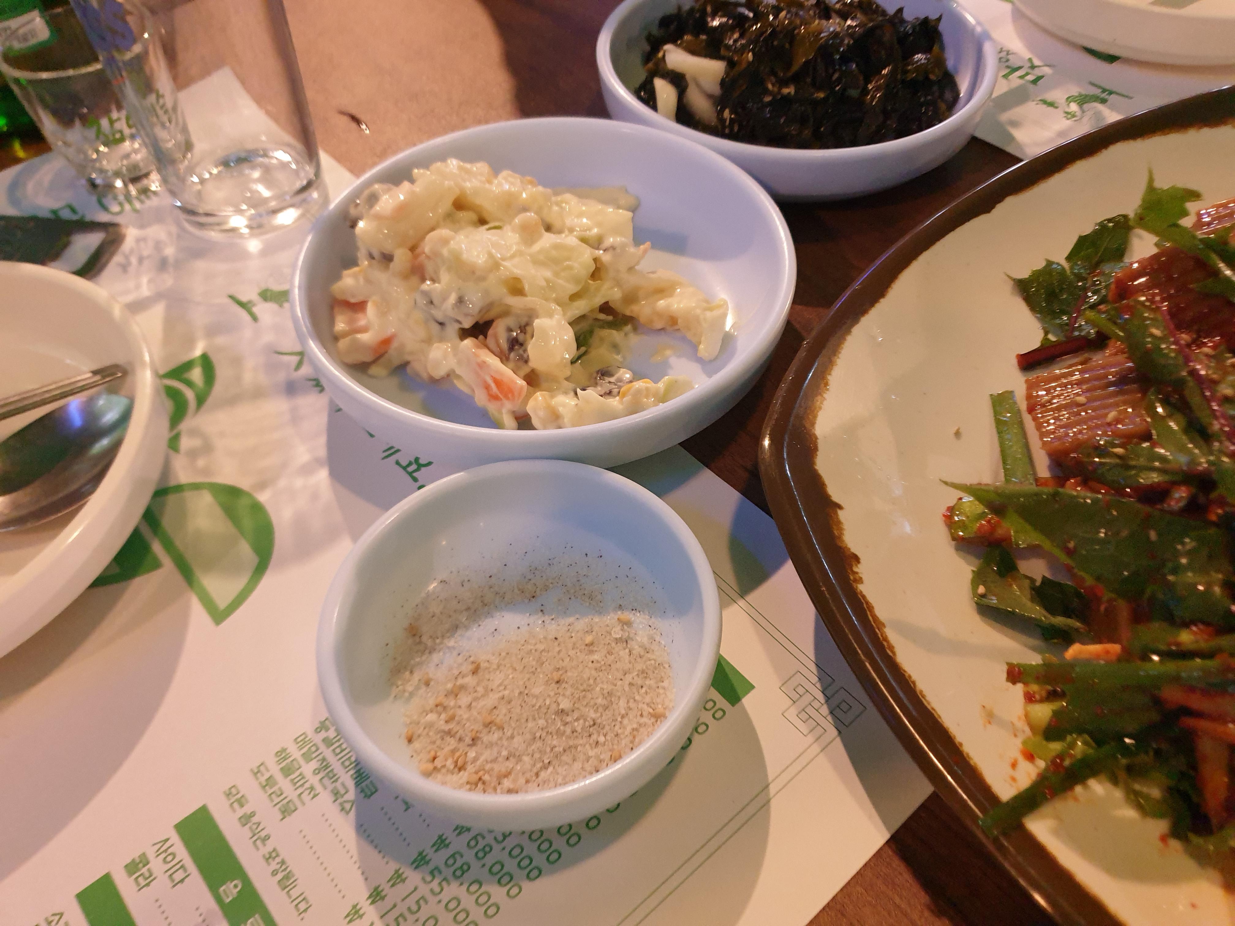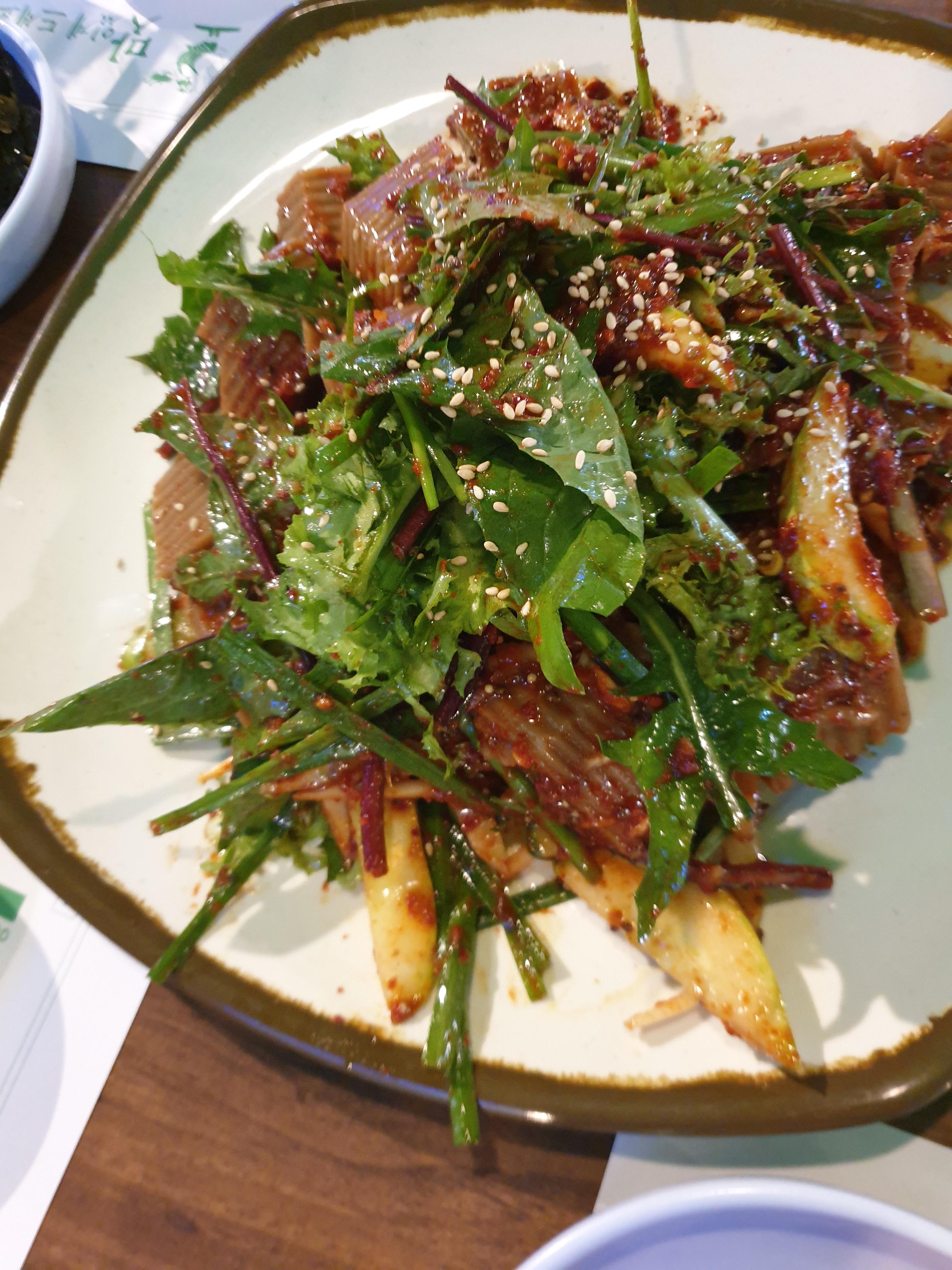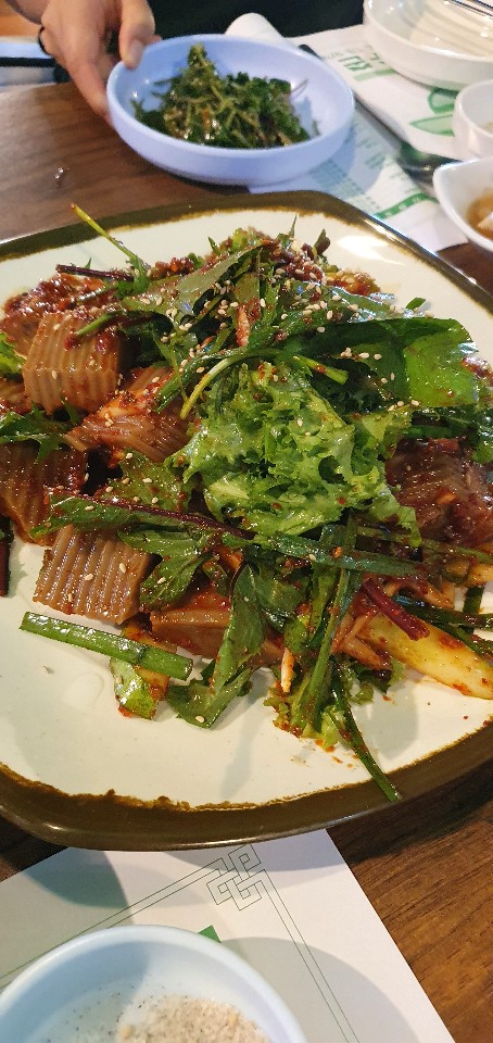 한소반쭈꾸미세트를 주문하면 이렇게 도토리 전, 샐러드, 도토리묵사발이 함께 나와요. 난 그냥 쭈꾸미를 시켰을 뿐인데 이렇게 푸짐하게 밑반찬을..!